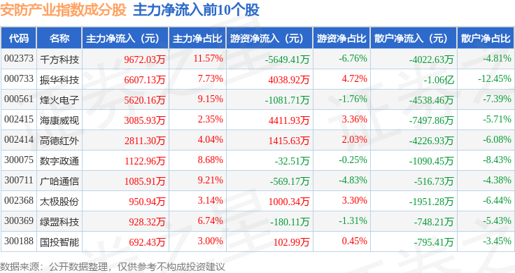 资金流向方面,安防产业(399693)指数成份股当日主力资金净流出合计14.11亿元,游资资金净流入合计2.84亿元,散户资金净流入合计11.27亿元。成份股资金流向详情见下表: