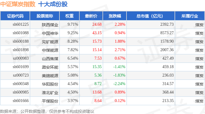 证券之星消息,11月10日,中证煤炭(399998)指数报收于2303.31点,涨0.59%,成交137.54亿元,换手率1.76%。当日该指数成份股中,上涨的有20家,新集能源以3.49%的涨幅领涨,下跌的有6家,华阳股份以2.24%的跌幅领跌。