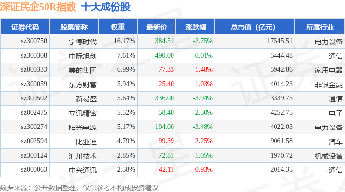 证券之星消息,11月10日,深证民企50R(470057)指数报收于3944.16点,跌0.59%,成交1643.54亿元,换手率1.93%。当日该指数成份股中,上涨的有32家,华东医药以5.38%的涨幅领涨,下跌的有18家,杰瑞股份以7.46%的跌幅领跌。