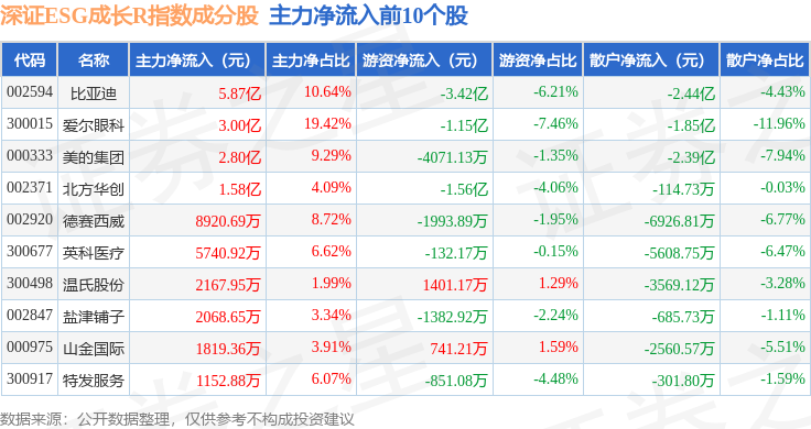 资金流向方面,深证ESG成长R(470060)指数成份股当日主力资金净流出合计47.03亿元,游资资金净流入合计8.23亿元,散户资金净流入合计38.8亿元。成份股资金流向详情见下表: