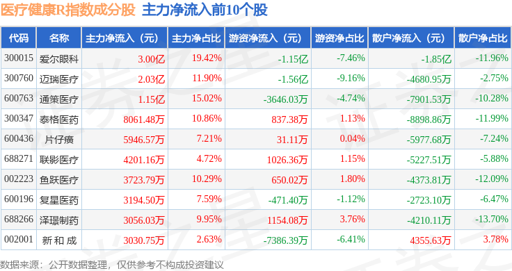 资金流向方面,医疗健康R(480016)指数成份股当日主力资金净流出合计2202.42万元,游资资金净流出合计5701.14万元,散户资金净流入合计7903.57万元。成份股资金流向详情见下表: