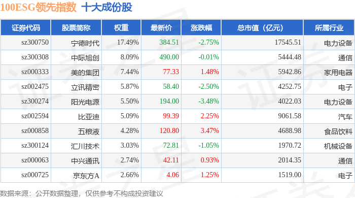 证券之星消息,11月10日,100ESG领先(970030)指数报收于6658.67点,跌0.35%,成交1545.46亿元,换手率1.44%。当日该指数成份股中,上涨的有33家,爱美客以4.92%的涨幅领涨,下跌的有16家,三花智控以6.01%的跌幅领跌。