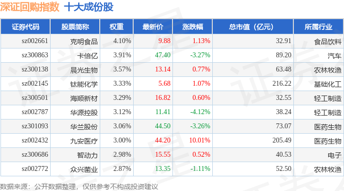 证券之星消息,11月10日,深证回购(970063)指数报收于2865.01点,涨0.85%,成交216.0亿元,换手率1.55%。当日该指数成份股中,上涨的有34家,孚日股份以10.04%的涨幅领涨,下跌的有14家,华源控股以4.12%的跌幅领跌。