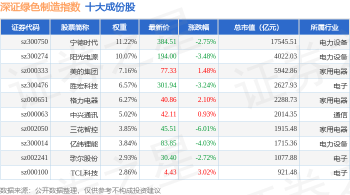 证券之星消息,11月10日,深证绿色制造(970069)指数报收于1950.07点,跌1.22%,成交1410.25亿元,换手率2.98%。当日该指数成份股中,上涨的有24家,爱美客以4.92%的涨幅领涨,下跌的有26家,欣旺达以7.01%的跌幅领跌。