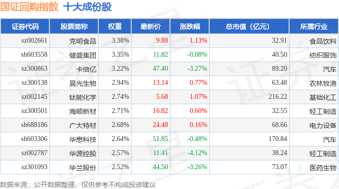 证券之星消息,11月10日,国证回购(980063)指数报收于3430.2点,涨0.65%,成交169.56亿元,换手率1.61%。当日该指数成份股中,上涨的有37家,九安医疗以10.01%的涨幅领涨,下跌的有12家,方大炭素以4.68%的跌幅领跌。