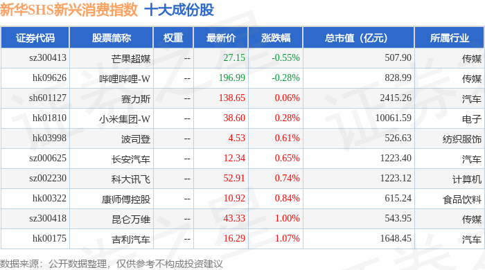 新华SHS新兴消费(989006)指数十大成份股详情如下: