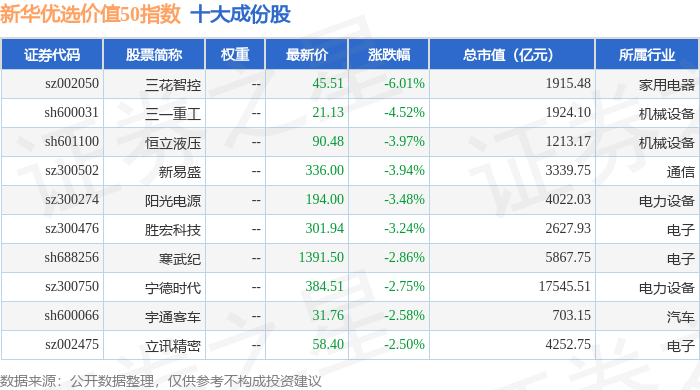 证券之星消息,11月10日,新华优选价值50(989004)指数报收于2196.39点,跌0.05%,成交2137.6亿元,换手率1.21%。当日该指数成份股中,上涨的有28家,泸州老窖以8.23%的涨幅领涨,下跌的有21家,三花智控以6.01%的跌幅领跌。