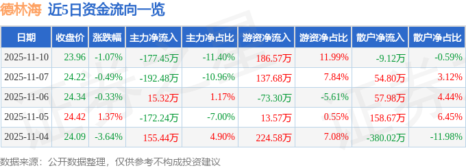 证券之星消息,截至2025年11月10日收盘,德林海(688069)报收于23.96元,下跌1.07%,换手率0.57%,成交量6473.0手,成交额1556.21万元。