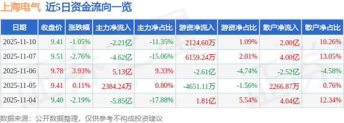 证券之星消息,截至2025年11月10日收盘,上海电气(601727)报收于9.41元,下跌1.05%,换手率1.64%,成交量207.08万手,成交额19.46亿元。