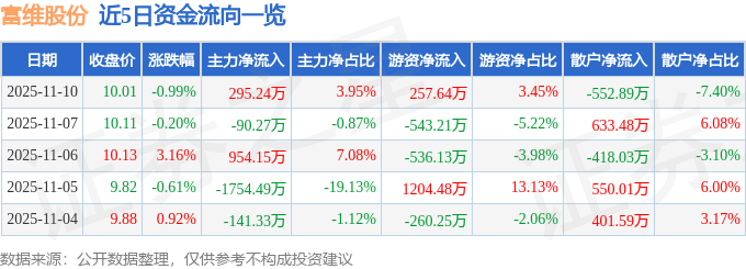 证券之星消息,截至2025年11月10日收盘,富维股份(600742)报收于10.01元,下跌0.99%,换手率1.01%,成交量7.49万手,成交额7475.51万元。