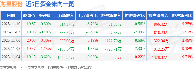 证券之星消息,截至2025年11月10日收盘,海星股份(603115)报收于19.87元,下跌0.3%,换手率1.93%,成交量4.67万手,成交额9265.18万元。