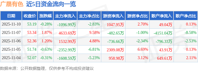 证券之星消息,截至2025年11月10日收盘,广晟有色(600259)报收于53.19元,下跌0.28%,换手率2.14%,成交量7.21万手,成交额3.88亿元。