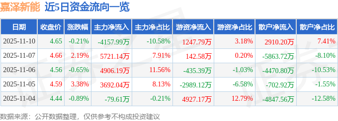 证券之星消息,截至2025年11月10日收盘,嘉泽新能(601619)报收于4.65元,下跌0.21%,换手率3.47%,成交量84.58万手,成交额3.93亿元。