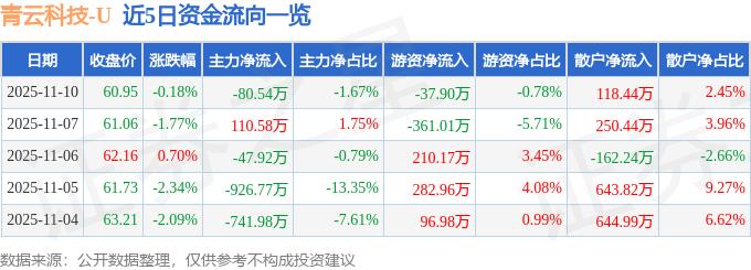 证券之星消息,截至2025年11月10日收盘,青云科技(688316)报收于60.95元,下跌0.18%,换手率1.65%,成交量7888.0手,成交额4831.78万元。