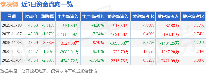 证券之星消息,截至2025年11月10日收盘,泰凌微(688591)报收于45.33元,下跌0.11%,换手率2.96%,成交量4.98万手,成交额2.23亿元。