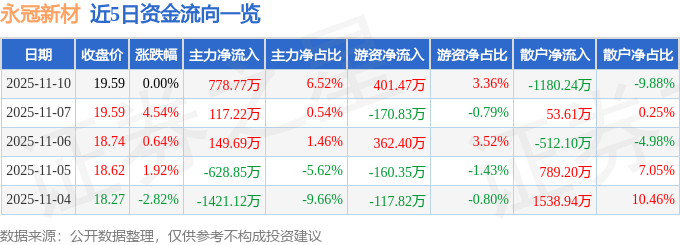 证券之星消息,截至2025年11月10日收盘,永冠新材(603681)报收于19.59元,上涨0.0%,换手率3.21%,成交量6.13万手,成交额1.2亿元。
