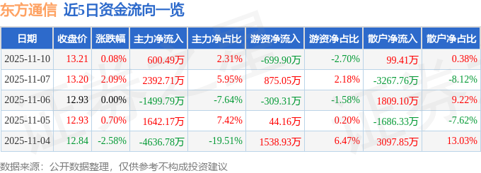证券之星消息,截至2025年11月10日收盘,东方通信(600776)报收于13.21元,上涨0.08%,换手率2.06%,成交量19.71万手,成交额2.59亿元。