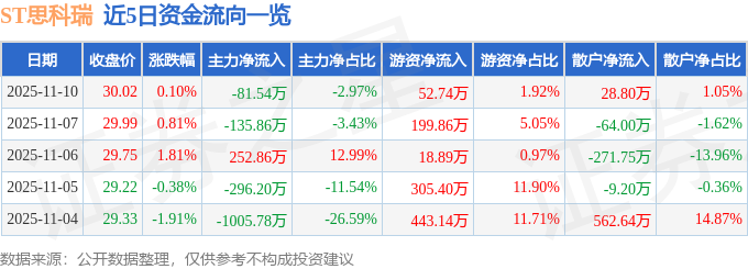 11月10日的资金流向数据方面,主力资金净流出81.54万元,占总成交额2.97%,游资资金净流入52.74万元,占总成交额1.92%,散户资金净流入28.8万元,占总成交额1.05%。