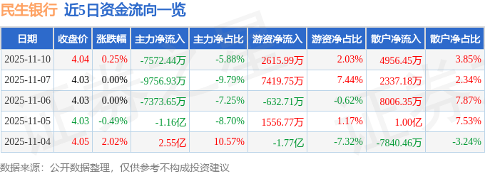 证券之星消息,截至2025年11月10日收盘,民生银行(600016)报收于4.04元,上涨0.25%,换手率0.9%,成交量319.37万手,成交额12.89亿元。