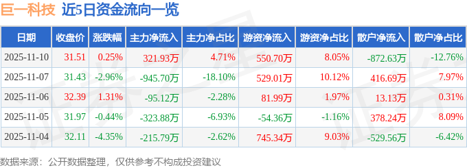 证券之星消息,截至2025年11月10日收盘,巨一科技(688162)报收于31.51元,上涨0.25%,换手率1.57%,成交量2.15万手,成交额6839.53万元。
