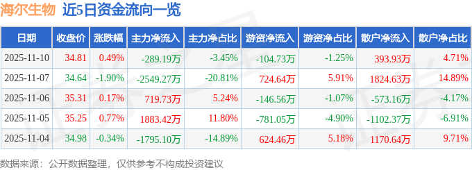证券之星消息,截至2025年11月10日收盘,海尔生物(688139)报收于34.81元,上涨0.49%,换手率0.76%,成交量2.41万手,成交额8372.03万元。