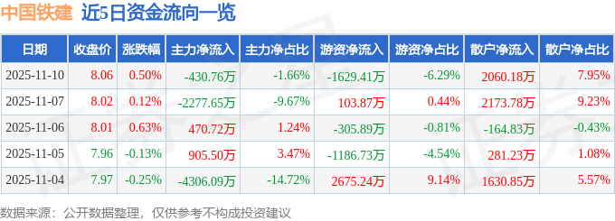 证券之星消息,截至2025年11月10日收盘,中国铁建(601186)报收于8.06元,上涨0.5%,换手率0.28%,成交量32.25万手,成交额2.59亿元。