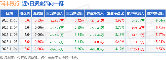 证券之星消息,截至2025年11月10日收盘,瑞丰银行(601528)报收于5.67元,上涨0.53%,换手率0.83%,成交量14.43万手,成交额8176.16万元。