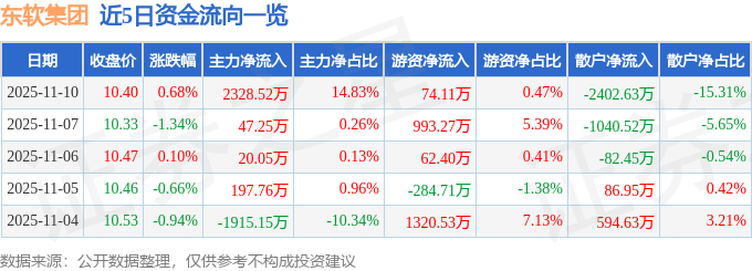 证券之星消息,截至2025年11月10日收盘,东软集团(600718)报收于10.4元,上涨0.68%,换手率1.27%,成交量15.11万手,成交额1.57亿元。