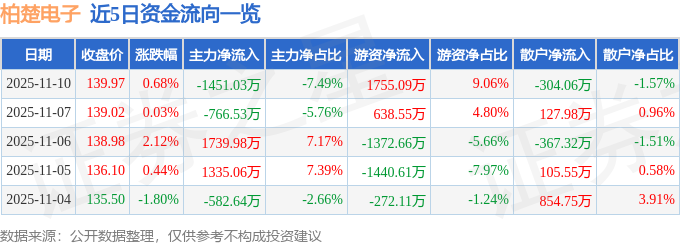 证券之星消息,截至2025年11月10日收盘,柏楚电子(688188)报收于139.97元,上涨0.68%,换手率0.48%,成交量1.39万手,成交额1.94亿元。