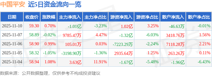 证券之星消息,截至2025年11月10日收盘,中国平安(601318)报收于59.3元,上涨0.7%,换手率0.5%,成交量52.95万手,成交额31.32亿元。