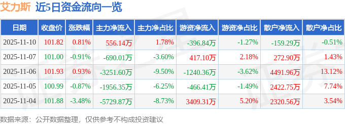 证券之星消息,截至2025年11月10日收盘,艾力斯(688578)报收于101.82元,上涨0.81%,换手率0.68%,成交量3.08万手,成交额3.12亿元。