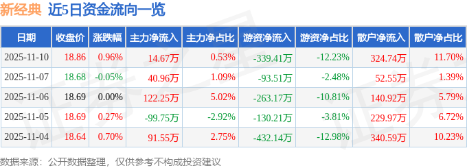 证券之星消息,截至2025年11月10日收盘,新经典(603096)报收于18.86元,上涨0.96%,换手率0.96%,成交量1.47万手,成交额2775.87万元。