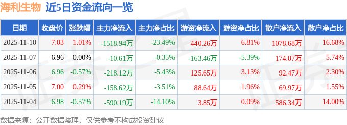 证券之星消息,截至2025年11月10日收盘,海利生物(603718)报收于7.03元,上涨1.01%,换手率1.42%,成交量9.23万手,成交额6466.8万元。