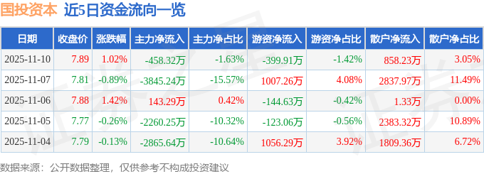 证券之星消息,截至2025年11月10日收盘,国投资本(600061)报收于7.89元,上涨1.02%,换手率0.56%,成交量35.85万手,成交额2.82亿元。