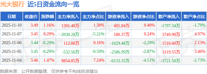 证券之星消息,截至2025年11月10日收盘,光大银行(601818)报收于3.49元,上涨1.16%,换手率0.62%,成交量289.11万手,成交额10.05亿元。