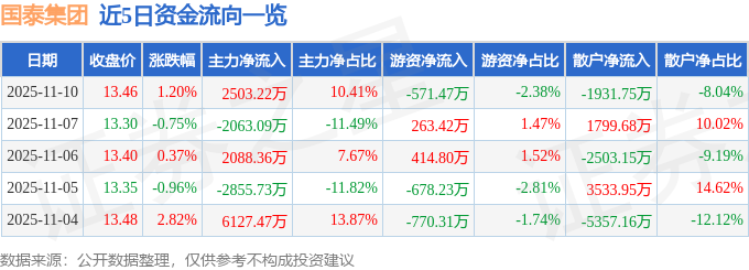 证券之星消息,截至2025年11月10日收盘,国泰集团(603977)报收于13.46元,上涨1.2%,换手率2.89%,成交量17.94万手,成交额2.4亿元。