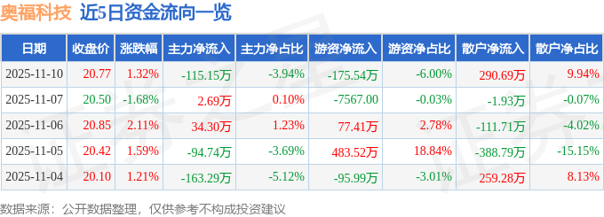 证券之星消息,截至2025年11月10日收盘,奥福科技(688021)报收于20.77元,上涨1.32%,换手率1.84%,成交量1.41万手,成交额2924.55万元。