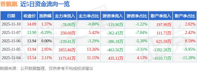 证券之星消息,截至2025年11月10日收盘,香飘飘(603711)报收于14.09元,上涨1.37%,换手率1.68%,成交量6.95万手,成交额9799.56万元。