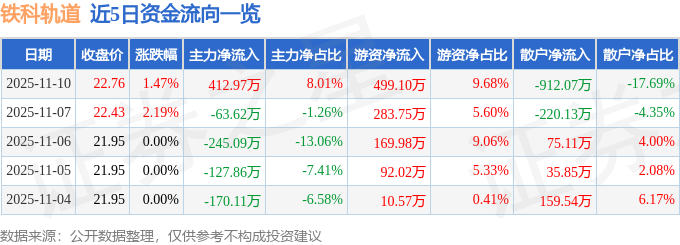 11月10日的资金流向数据方面,主力资金净流入412.97万元,占总成交额8.01%,游资资金净流入499.1万元,占总成交额9.68%,散户资金净流出912.07万元,占总成交额17.69%。