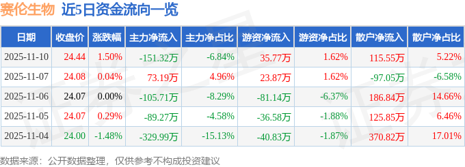 证券之星消息,截至2025年11月10日收盘,赛伦生物(688163)报收于24.44元,上涨1.5%,换手率0.84%,成交量9093.0手,成交额2212.8万元。