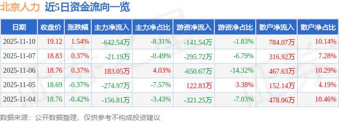 证券之星消息,截至2025年11月10日收盘,北京人力(600861)报收于19.12元,上涨1.54%,换手率1.11%,成交量4.08万手,成交额7732.12万元。