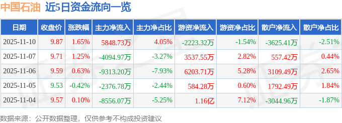 证券之星消息,截至2025年11月10日收盘,中国石油(601857)报收于9.87元,上涨1.65%,换手率0.09%,成交量146.99万手,成交额14.43亿元。