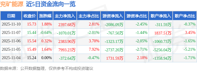 证券之星消息,截至2025年11月10日收盘,兖矿能源(600188)报收于15.73元,上涨1.88%,换手率0.92%,成交量54.23万手,成交额8.53亿元。
