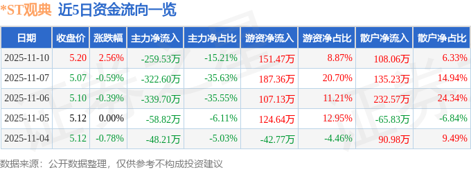 证券之星消息,截至2025年11月10日收盘,*ST观典(688287)报收于5.2元,上涨2.56%,换手率0.89%,成交量3.29万手,成交额1706.86万元。