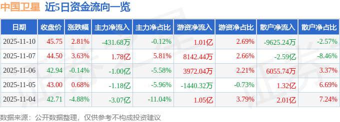 证券之星消息,截至2025年11月10日收盘,中国卫星(600118)报收于45.75元,上涨2.81%,换手率6.9%,成交量81.63万手,成交额37.43亿元。