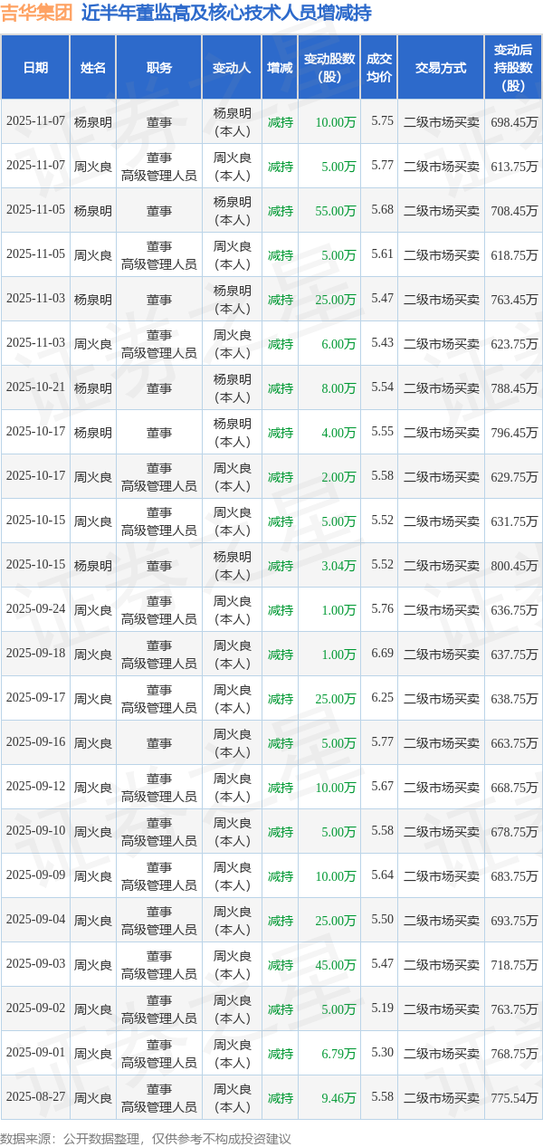 吉华集团近半年内的董监高及核心技术人员增减持详情如下: