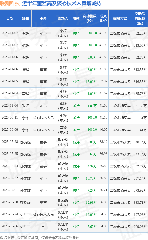联测科技近半年内的董监高及核心技术人员增减持详情如下: