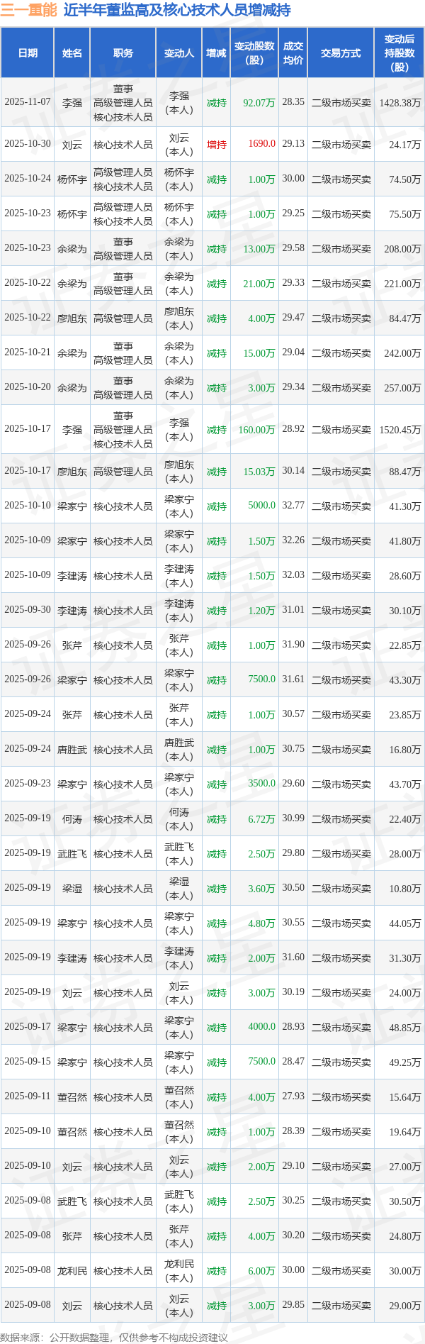 三一重能近半年内的董监高及核心技术人员增减持详情如下: