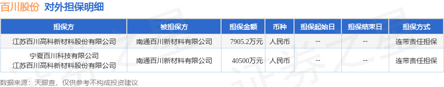 百川股份11月7日披露2笔对外担保,被担保方为南通百川新材料有限公司。对外担保明细如下表: