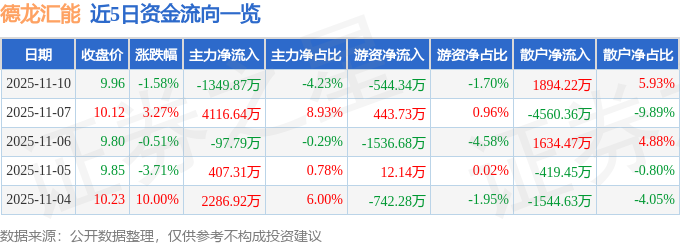 证券之星消息,截至2025年11月10日收盘,德龙汇能(000593)报收于9.96元,下跌1.58%,换手率9.02%,成交量32.32万手,成交额3.19亿元。